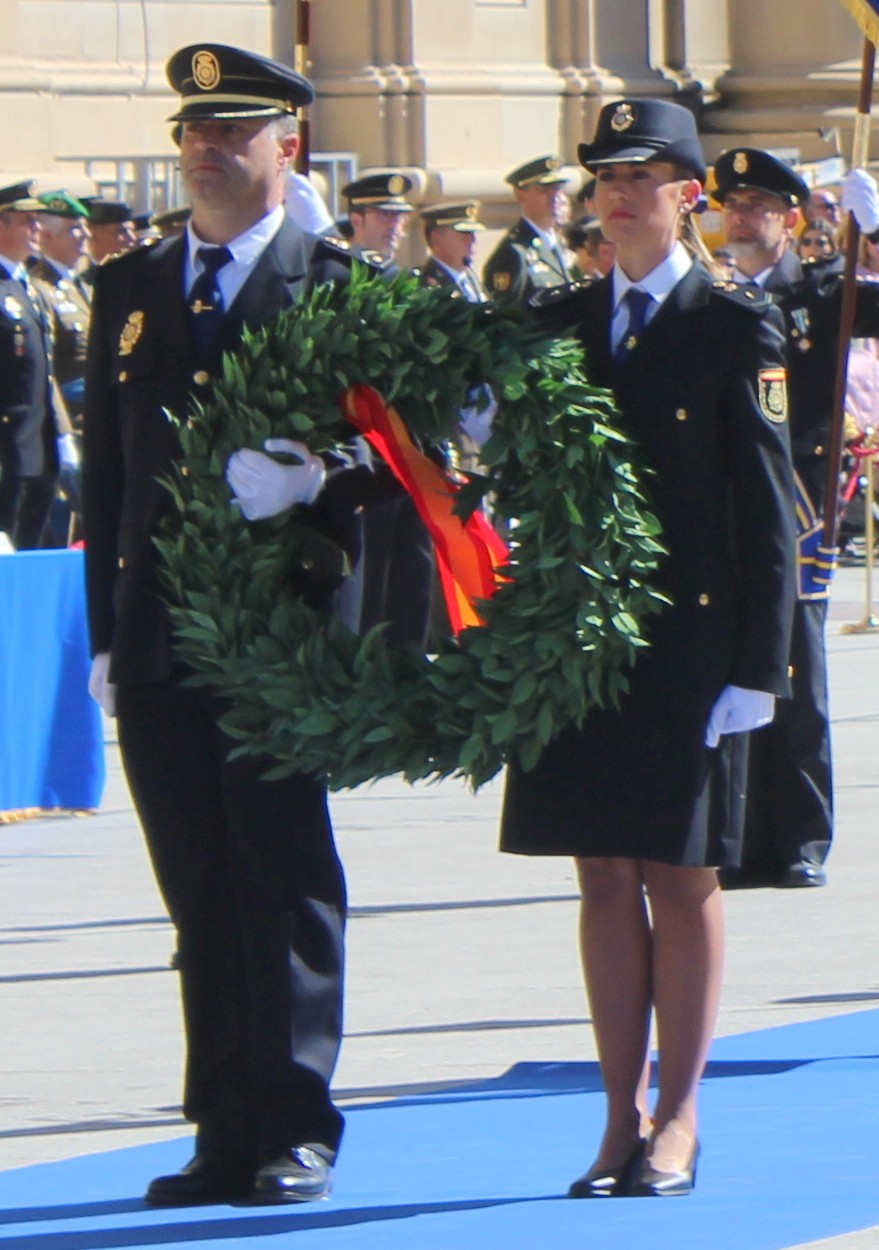 A continuación, la Delegada del Gobierno y el Jefe Superior de Policía en Aragón depositaron una corona de laureles en la base del monolito, acompañados del Subdelegado del Gobierno en Zaragoza y del Comisario Policial de Zaragoza.