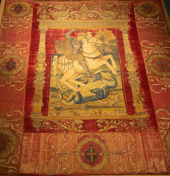 En el zaguán, Don Pedro fue saludado por otros dignatarios de la RMCZ, diversos miembros de la nobleza, y varios de los Caballeros que iban a ingresar al día siguiente en el Real Cuerpo, así como otras relevantes personalidades. Don Luis Navarro y Elola mostró a Don Pedro un cuadro que luce allí desde hace relativamente poco tiempo en el que aparece San Jorge con armadura, sobre un caballo con gualdrapas de la Bandera de Aragón.