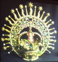 El primero de los sucesos históricos que mermaron esta colección fue el episodio de la invasión francesa, el episodio de los Sitios de Zaragoza, ese expolio francés, y el segundo fue una subasta pública de alhajas que se hace en 1870, un episodio triste pero necesario porque sirvió para financiar la finalización del templo del Pilar que hoy podemos visitar, todavía estaba el templo barroco sin acabar. Por lo tanto tenemos 1809 y 1870 como dos golpes importantes sufridos por el tesoro del Pilar, que recibió ofrendas de alhajas desde la Baja Edad Media. Vamos a ver un hilo temporal desde 1255, siglo XIII, hasta la actualidad, con los hitos más importantes. Desde estas primeras ofrendas ya se ve como el tesoro del Pilar tiene una gran internacionalización en sus soportes y en sus donantes. Veremos desde el comienzo ofrendas de esmaltes de Limoges, cristal de roca, marfiles…en fin todo tipo de ofrendas en los inventarios bajomedievales, y personalidades muy importantes haciendo ofrendas al tesoro del Pilar.
