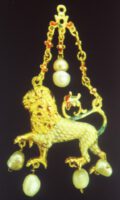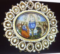 El primero de los sucesos históricos que mermaron esta colección fue el episodio de la invasión francesa, el episodio de los Sitios de Zaragoza, ese expolio francés, y el segundo fue una subasta pública de alhajas que se hace en 1870, un episodio triste pero necesario porque sirvió para financiar la finalización del templo del Pilar que hoy podemos visitar, todavía estaba el templo barroco sin acabar. Por lo tanto tenemos 1809 y 1870 como dos golpes importantes sufridos por el tesoro del Pilar, que recibió ofrendas de alhajas desde la Baja Edad Media. Vamos a ver un hilo temporal desde 1255, siglo XIII, hasta la actualidad, con los hitos más importantes. Desde estas primeras ofrendas ya se ve como el tesoro del Pilar tiene una gran internacionalización en sus soportes y en sus donantes. Veremos desde el comienzo ofrendas de esmaltes de Limoges, cristal de roca, marfiles…en fin todo tipo de ofrendas en los inventarios bajomedievales, y personalidades muy importantes haciendo ofrendas al tesoro del Pilar.