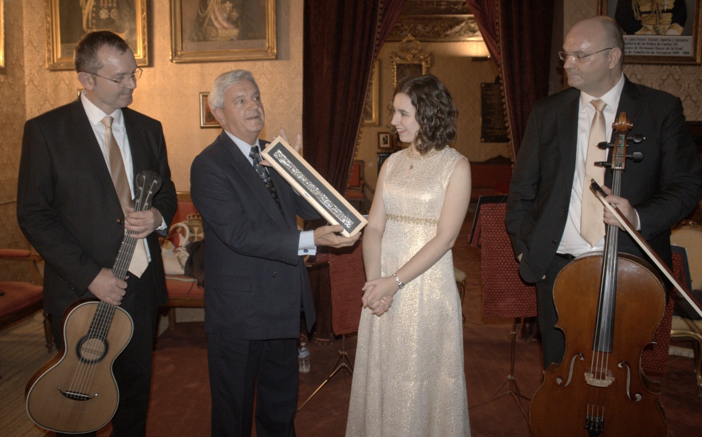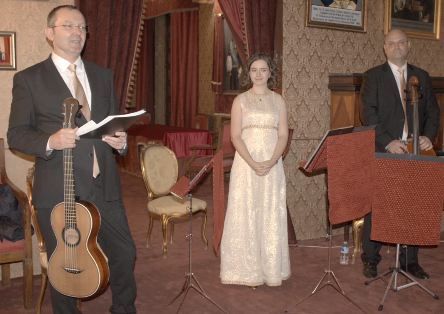 Vamos a tener el placer de interpretarla, por primera vez probablemente desde hace 200 años, desde que se editara, porque no hay registros de que esta pieza se haya tocado nunca con guitarra, con voz. Luego tocaremos también piezas de la Reina Hortensia de Holanda, de las que en su mayoría no hay registros. De una de ellas sí que hay una grabación con piano, pero no hay grabaciones de las versiones con guitarra, ni de la segunda obra que tocaremos tampoco, también es una pieza inédita. Así que es un placer tocar para ustedes este repertorio, que es precioso, y que además ni siquiera sabemos si llegó a interpretarse fuera de los salones y las fiestas privadas que realizaba la nobleza y la realeza en la época. Así que muchas gracias por venir, esperemos que les guste el concierto y que seamos dignos de su presencia aquí, Gracias.