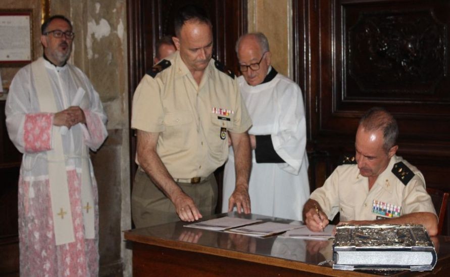 Seguidamente, el Delegado de Culto y Pastoral, José Antonio Calvo Gracia dio paso a la secuencia de la firma del documento testimonial que fue signado por el Capellán de la Virgen José María Bordetas y por el Jefe del Regimiento de Caballería “España” Nº 11, Francisco Javier Calero Perea, y a continuación por los testigos presentes. Anunció José Antonio Calvo que, según lo manifestado por el Capellán José Antonio Bordetas, el día del Señor Santiago la Virgen tiene manto propio, pero la víspera, el día 24, no, y que desde ahora el día 24 de julio la Virgen llevará siempre este manto.