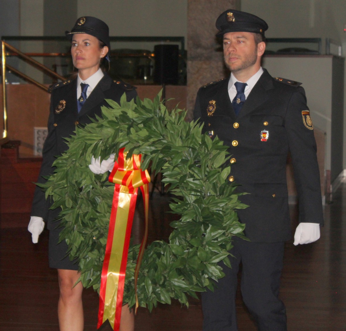 Una oficial y un oficial de la Policía Nacional portaron y depositaron una corona de laureles, con la Bandera de España, en el monolito de homenaje a los caídos.